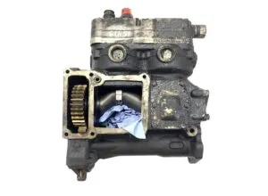 This air compressor is a second-hand product for MAN vehicles. It is compatible with the following part numbers: 5154100-7115, 51541007115, 51541007197, 5154100-7197, 51541007228, 5154100-7228, 51541007249, 5154100-7249, 51541009228, 5154100-9228. The compressor shows signs of wear and dirt but is functional. It is equipped with a gear mechanism visible in the open part of the case. This product is ideal for replacing defective air compressors on compatible MAN vehicles.