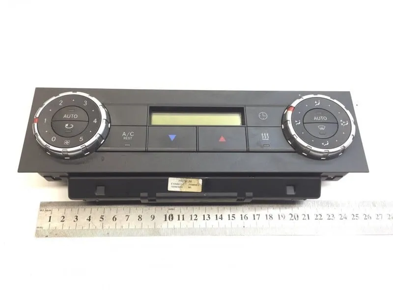 This climate control panel is designed for Mercedes-Benz vehicles. It is equipped with two rotary buttons for adjusting the temperature and fan speed, marked with AUTO for automatic operation. The panel also includes a central digital display to view the current settings.