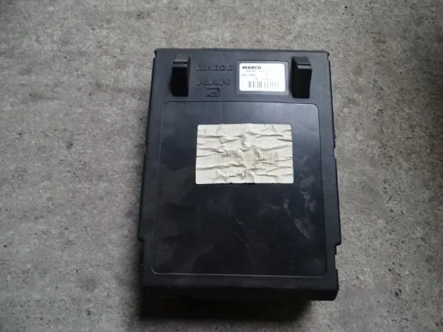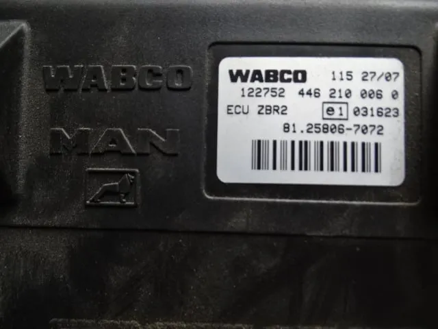 This product is a ZBR2 WABCO calculator for MAN vehicles, with reference codes 81258067072 and 4462100060. The casing is black and features two labels: one with product identification information and another that is partially damaged. The device is intended for electronic control of braking systems.