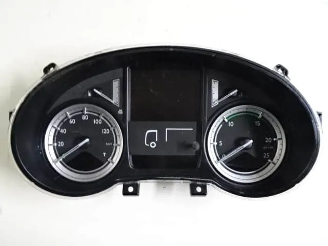 This product is a dashboard for DAF trucks, equipped with two analog gauges and a central digital display. The panel includes a speedometer calibrated up to 120 km/h and an air pressure indicator up to 25 bar. The central display is intended to show additional information such as warnings or the vehicle’s status. The panel has a robust and elegant design, ideal for use in DAF commercial vehicles.
