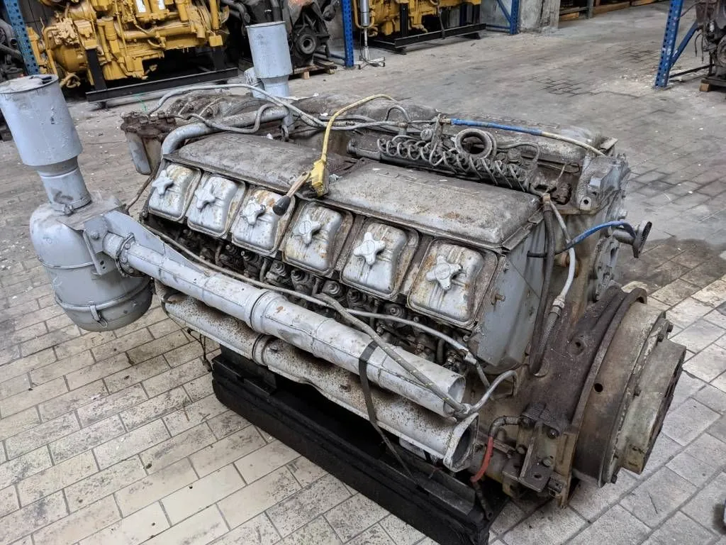 This Deutz A12L714 engine is a second-hand engine, ideal for various industrial applications. The engine has 12 cylinders, known for its reliability and high performance. It is equipped with a robust exhaust system and various cables and connections necessary for operation.