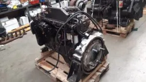 The engine is mounted on a wooden pallet for easy transport and storage. The engine casing is robust, and the components are well protected against wear and impact. Wires and pipes that are part of the engine’s fuel and cooling system are visible.
