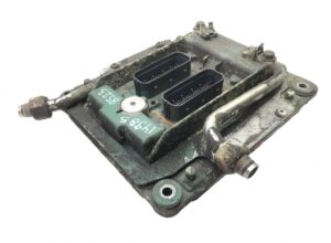 Engine Control Unit (ECU) for Volvo, model 21354347 / 23444942-43. This is an essential component for managing the performance of your vehicle’s engine, ensuring optimal and efficient operation. The unit features two well-defined connection ports for integration with the vehicle’s systems. The device appears to be used, showing signs of wear and dirt, but the essential components seem to be in good working condition.