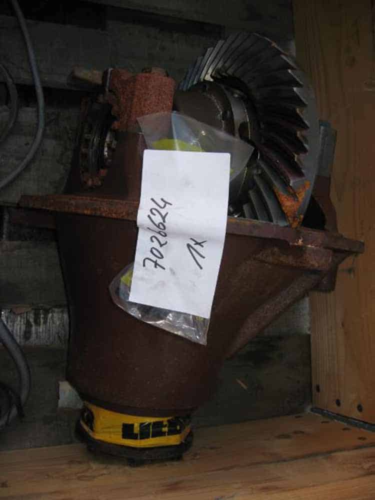 The dimensions and specifications of this differential conform to Liebherr standards, thus ensuring perfect compatibility with the A924 model. Additionally, the product is identifiable by a label with reference code 7026624, which facilitates the identification and ordering of the correct part for maintenance or repairs.