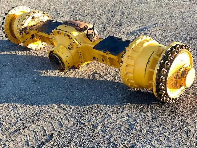 Front axle for Volvo L180, intended for construction machinery and heavy vehicles. Made from durable materials, this front axle is designed to withstand heavy loads and ensure efficient and safe operation. The axle is yellow and shows signs of wear, indicating prior use, but the structure and main components appear to be in good condition. It is equipped with robust discs and hubs, ready to deliver optimal performance on various types of terrain.
