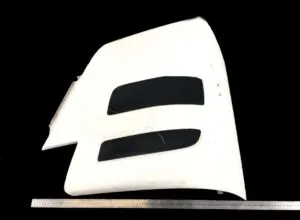 The product is white, with two black cutouts, and is made from durable materials for enhanced resistance. The dimensions are indicated in the image, with a ruler for reference.