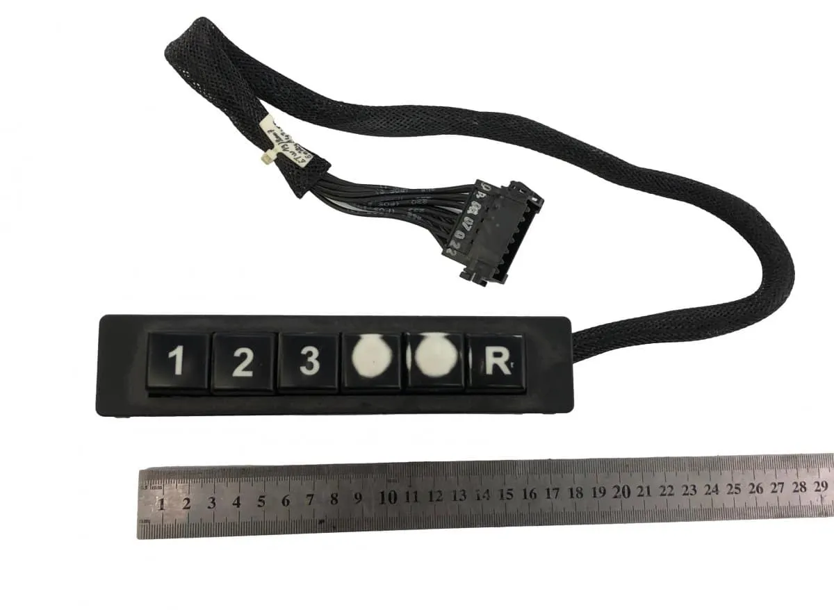Speed selector switch for Volvo trucks, compatible with the following codes: 20814112, 21172824, 23017113, 23603120. The product includes a panel with buttons numbered from 1 to 3 and a reverse (R) button, intended for controlling gear shifting.