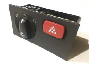 The Scania headlight switch is an original product designed for Scania trucks. It features a rotary button for controlling the headlights and a red button for emergencies. The rotary button allows you to select position lights, low beam, and high beam, with the corresponding symbols inscribed for easy use. The red emergency button is also clearly marked with a white triangle for quick identification. This switch is compatible with several models of Scania trucks, having reference codes 1540673, 1900317, and 2252076.