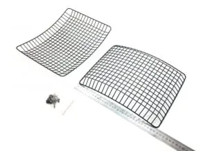 Protection mesh for Scania headlights, product code 866380-28. The set includes two black metal protection meshes, with a grille design to provide optimal protection for your vehicle’s headlights. The dimensions of each mesh are approximately 37 cm x 32 cm, according to the ruler shown in the image. The meshes have a curved shape to fit perfectly with the headlights. The set also includes mounting elements for easy and secure installation.