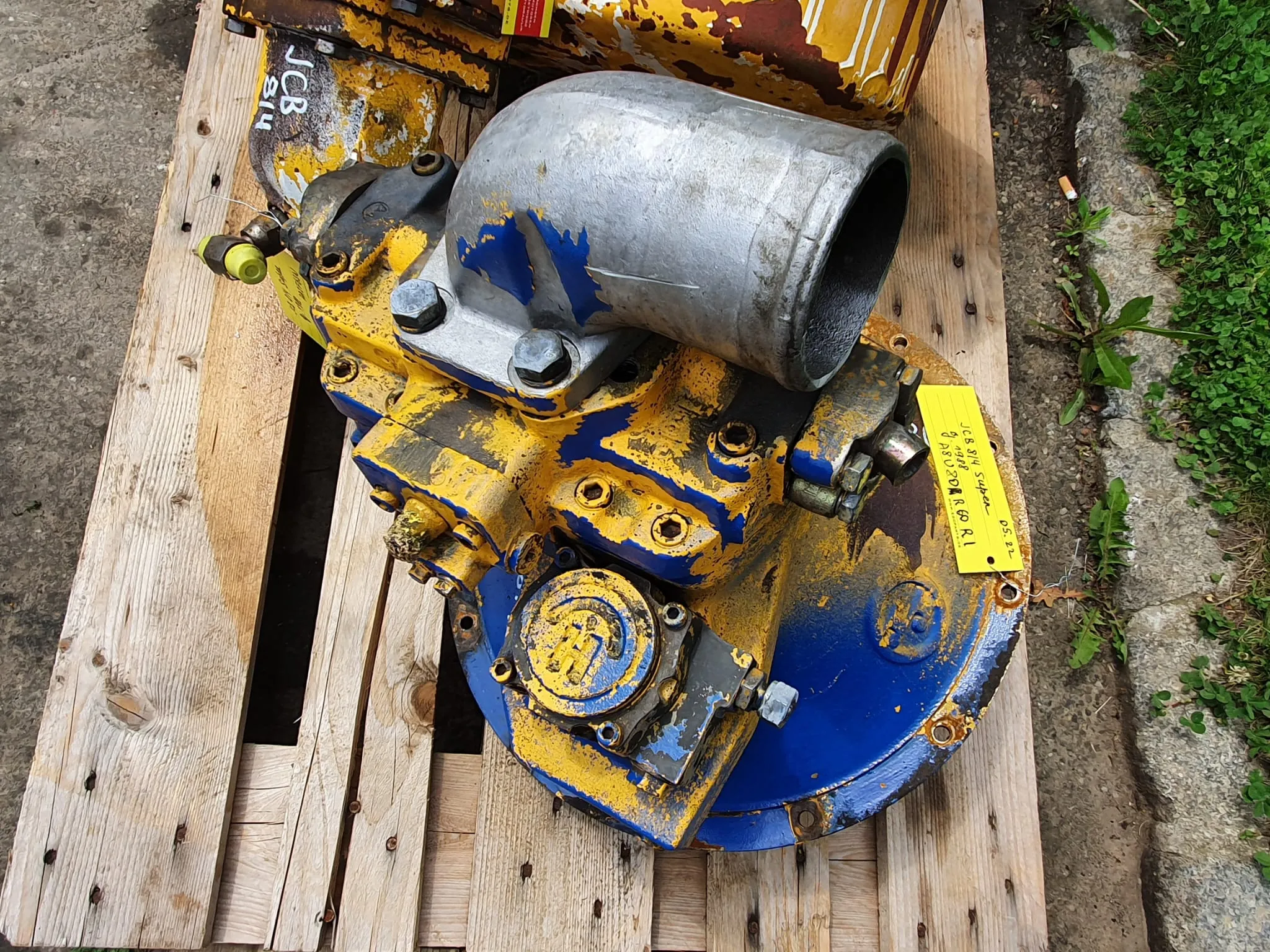 This product is a refurbished hydraulic pump for JCB 814 excavator. The component shows visible signs of refurbishment but is in good working condition. The predominant color of the pump is yellow, with blue accents, and it is mounted on a wooden pallet for stability and easy transport.