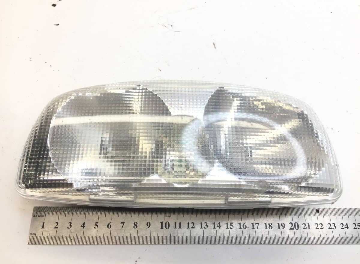 Description: This interior light for Mercedes is an essential accessory for the interior lighting of your vehicle, providing enhanced visibility and a modern design. The product has a transparent finish with a textured pattern to evenly disperse light. Exact measurements are shown in the image, along with a ruler indicating the approximate dimensions of the product.