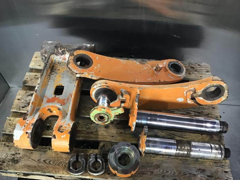 This set of components includes parts for a Liebherr 904 excavator arm. The parts are made of metal and show signs of wear and superficial rust, indicating previous use. The set includes:
