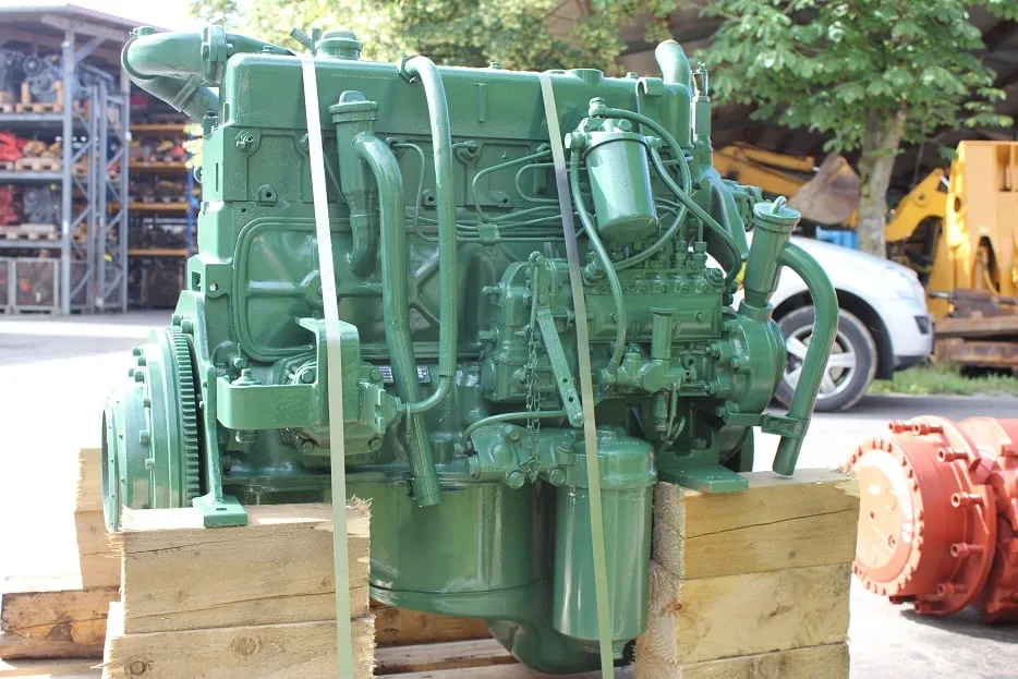 Mercedes-Benz OM 352 engine painted in green, mounted on a wooden support. This robust diesel engine is suitable for various industrial and automotive applications. It is secured with belts for stability and protected for transport. The engine features precise details of mechanical components, including the turbocharger and gears, ensuring performance and durability.