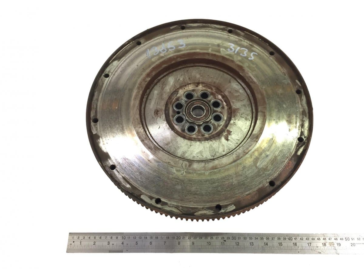 The product is used and in good condition. In the image, moderate wear can be observed, but without major structural defects. The exact dimensions of the flywheel are indicated using a 50 cm ruler.