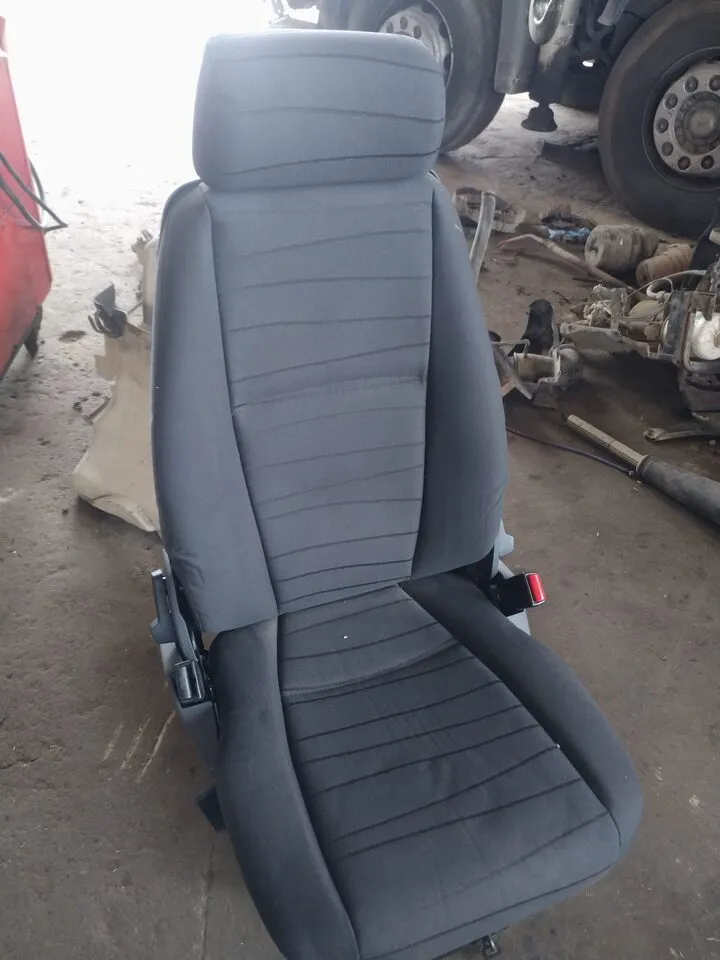 This passenger seat is compatible with the 2011 Scania R440 model. The seat is covered with black fabric and features an ergonomic design for passenger comfort. The backrest and seat are equipped with horizontal stitching for added durability and aesthetics. The headrest is integrated for proper head support. The seat comes with a manual adjustment system to ensure a comfortable position during travel. It is ideal for replacing the damaged original passenger seat or for enhancing comfort in the truck.