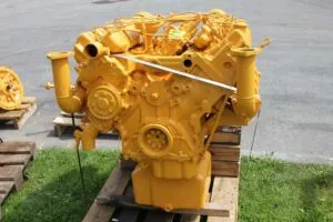The engine is painted in a vibrant shade of yellow, providing both protection against corrosion and an aesthetically pleasing appearance. It is mounted on a wooden pallet for easy transport and handling.