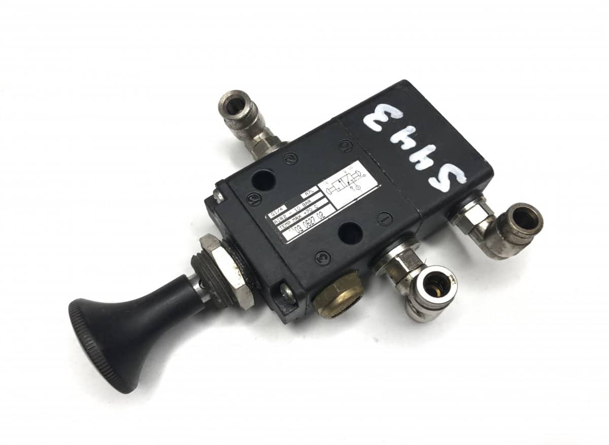 This product is a component for Scania vehicles, identified by the code 03062702-11. It is designed to be used in pneumatic or hydraulic systems. The part is black, equipped with several metal connectors and a rotary handle. On the front, there is a small identification panel with technical specifications and a functioning diagram. The product is marked with the code “SH43”.
