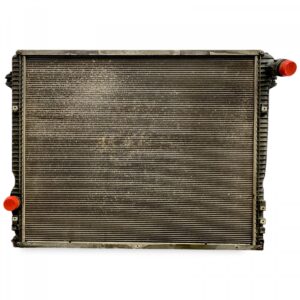 This radiator is compatible with Scania truck models, having reference codes 2552201 and 2473321. It is manufactured to ensure efficient engine cooling, maintaining optimal vehicle performance. The red connectors on the side indicate the connection points for the cooling tubes.