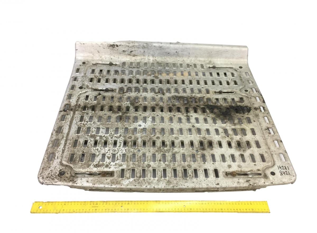 The approximate dimensions of the plate are indicated by a yellow ruler placed at the bottom of the image. The plate shows signs of wear and dirt, but its structure remains intact, suggesting increased durability and long-term use.