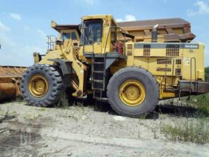 This Komatsu WA600-3L front loader is available for parts from dismantling. The machine, yellow in color, has robust tires and a solid design, specific to large-capacity equipment. It is equipped with a spacious cabin, protected by a metal structure, and features safety equipment such as a fire extinguisher mounted next to the cabin. The engine and mechanical components are well protected by metal casings, allowing for increased durability in heavy working conditions. It is ideal for spare parts needed for the maintenance and repair of other similar machines.