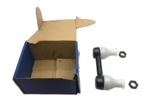 Stabilizer bar link for the drive axle for Volvo, compatible with codes 22342057 and 24425411. This product is essential for maintaining the stability and safety of your vehicle. The set includes two main components and two fastening nuts. The packaging is a blue cardboard box, ensuring the protection of the product during transport.