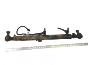 The product includes the necessary hydraulic and mechanical connections for integration into the vehicle’s steering system. The dimensions of the cylinder are shown in the image, being comparable to a 50 cm ruler for a clear reference of the total length.