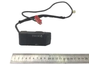 Steering wheel switch module for Renault, part number 5010271974. This module is intended for mounting on the right side of the steering wheel and is equipped with a connection cable and red connector. The module includes buttons for volume control (+/-) and other multimedia functions, indicating the ability to control music and other features from the steering wheel. The dimensions of the module are approximately 15 cm in length, as can be seen in comparison with the ruler in the image.