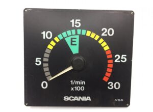 The Scania tachometer is a measuring instrument for engine RPM, displaying values from 0 to 30 (1/min x 100). It is designed for use on Scania vehicles and is manufactured by VDO. The scale is divided into colored segments to indicate different RPM ranges: