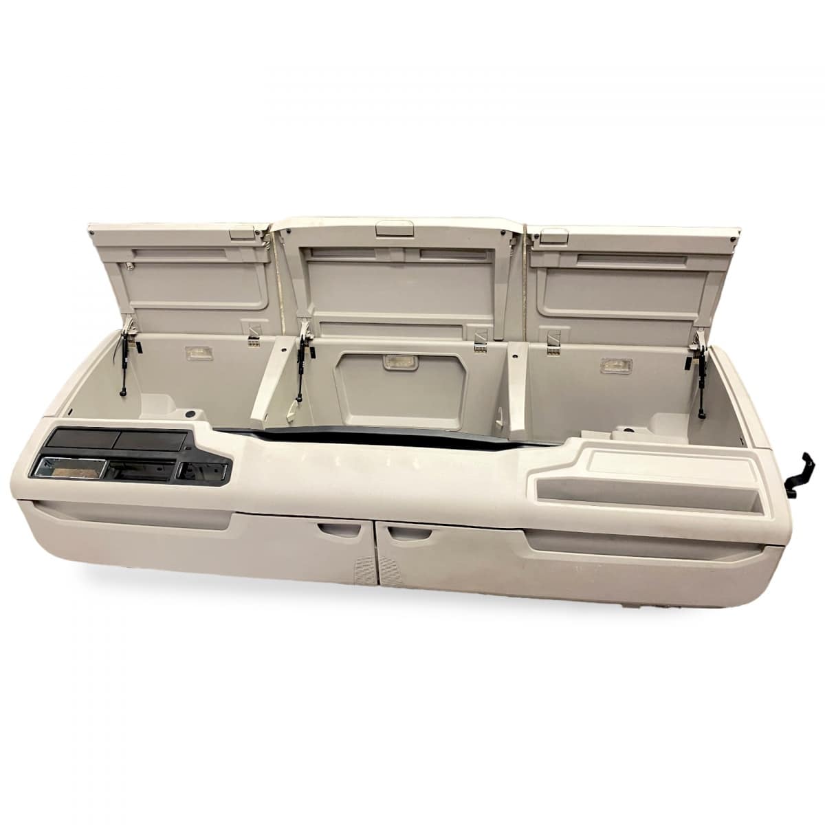 The compartment features three distinct sections, each with its own lid, which open vertically for easy access. Each lid is equipped with a secure and reliable locking system.