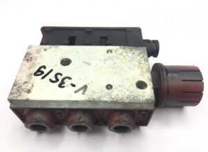 Used ELC Volvo valve, part number: 3112823, 3944717, 481830, 5010347767, 1528269-11. The valve shows signs of wear and dirt, but is fully functional. The top part of the valve is made of metal, engraved with the code “1-3E-19”. The bottom and sides are painted red, with three connection holes. This product is compatible with various Volvo truck models. Ideal for replacing defective or worn valves.