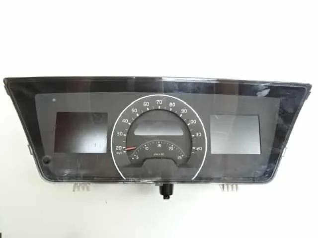 This dashboard for Volvo trucks is designed to provide essential information to the driver. Its robust design and clear display allow for easy reading of speed and other important data. It is equipped with a central speedometer calibrated up to 120 km/h and two side screens for displaying additional information.