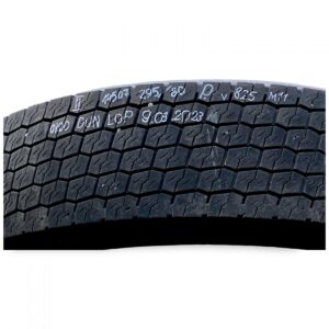 Wheel for Volvo vehicles, size 295/80R22.5. The tire has specifications 22.5×8.25 and 225×8.25. It was manufactured on March 9, 2023. The tread design provides optimal grip and durability, ideal for long road use and various road conditions.